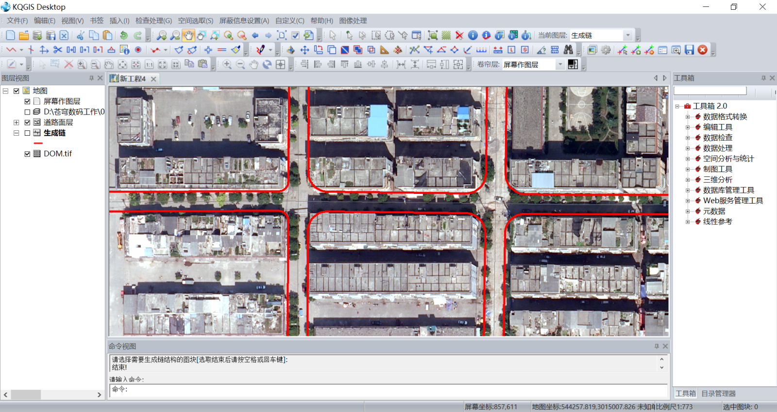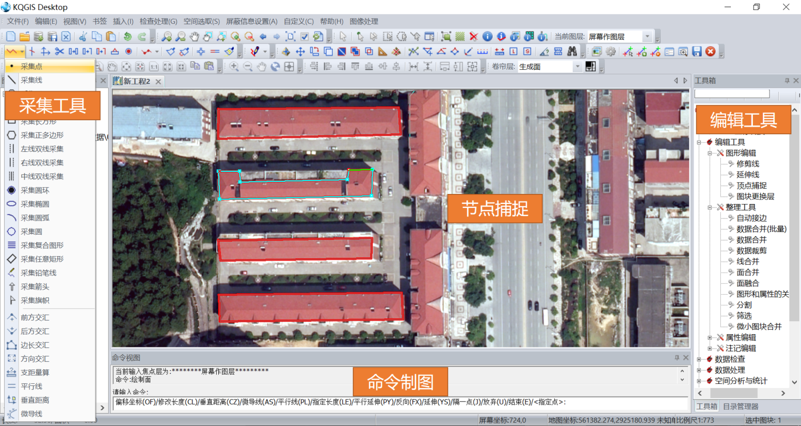 KQGIS Desktop獨(dú)創(chuàng)GIS與CAD相結(jié)合的采集模式,保留CAD命令輸入的采集方式,兼顧規(guī)劃專業(yè)用戶的操作習(xí)慣,提高數(shù)據(jù)采集的便捷性與采集效率,同時(shí)保證采集數(shù)據(jù)符合GIS數(shù)據(jù)的特性,擁有較強(qiáng)的擴(kuò)展性和兼容性。