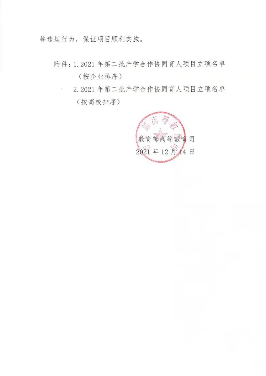 12月14日,《教育部高等教育司關(guān)于公布2021年第二批產(chǎn)學(xué)合作協(xié)同育人項目立項名單的通知》正式印發(fā)。
