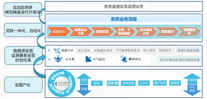 系統(tǒng)基于蒼穹自主研發(fā)的全國產(chǎn)化KQGIS、RS平臺(tái),實(shí)現(xiàn)空天數(shù)據(jù)自動(dòng)下載、數(shù)據(jù)處理、基于AI技術(shù)的水體/下墊面信息提取、洪水淹沒分析、洪水影響分析、數(shù)據(jù)展示、專題圖制作等自動(dòng)化、一體化的業(yè)務(wù)流程,支撐流域、河湖、蓄滯洪區(qū)等防洪遙感應(yīng)急監(jiān)測(cè)需求。具有接入數(shù)據(jù)源全面、監(jiān)測(cè)要素全面、時(shí)效性高且安全可靠等特點(diǎn)。