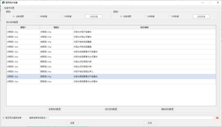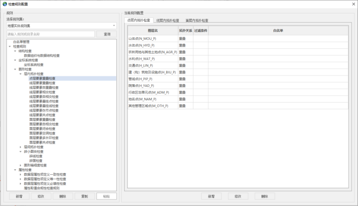 針對具體的數(shù)據(jù)檢查項目,基于系統(tǒng)提供的檢查算子,結合不同的數(shù)據(jù)規(guī)范要求,形成檢查規(guī)則集:一方面可按照數(shù)據(jù)規(guī)范明確的內(nèi)容進行配置,另一方面可結合地方特色進行本地化的規(guī)則細項配置,自由組裝形成對應的檢查規(guī)則,滿足不同業(yè)務場景及本地化需求的地理信息數(shù)據(jù)質(zhì)量核查要求。