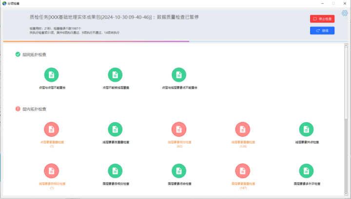 系統(tǒng)提供交互式質(zhì)檢能力,賦予用戶更加直觀、高效的質(zhì)檢體驗,支持對質(zhì)檢全過程的監(jiān)控與調(diào)度,允許用戶在質(zhì)檢進行中隨時暫?;蛑貑?,即時查看當前的質(zhì)檢情況,確保隨控隨檢、無遺漏。同時采用圖屬聯(lián)動的方式,對質(zhì)檢結果進行可視化定位以及以質(zhì)檢報告形式導出,實現(xiàn)質(zhì)檢全流程數(shù)據(jù)的可回溯。