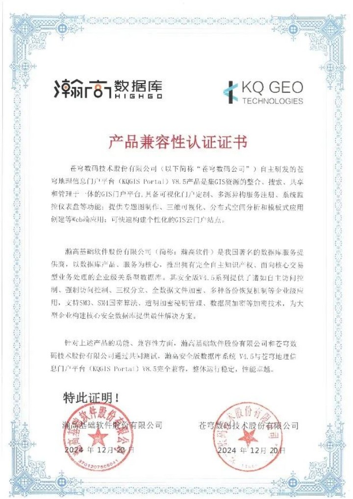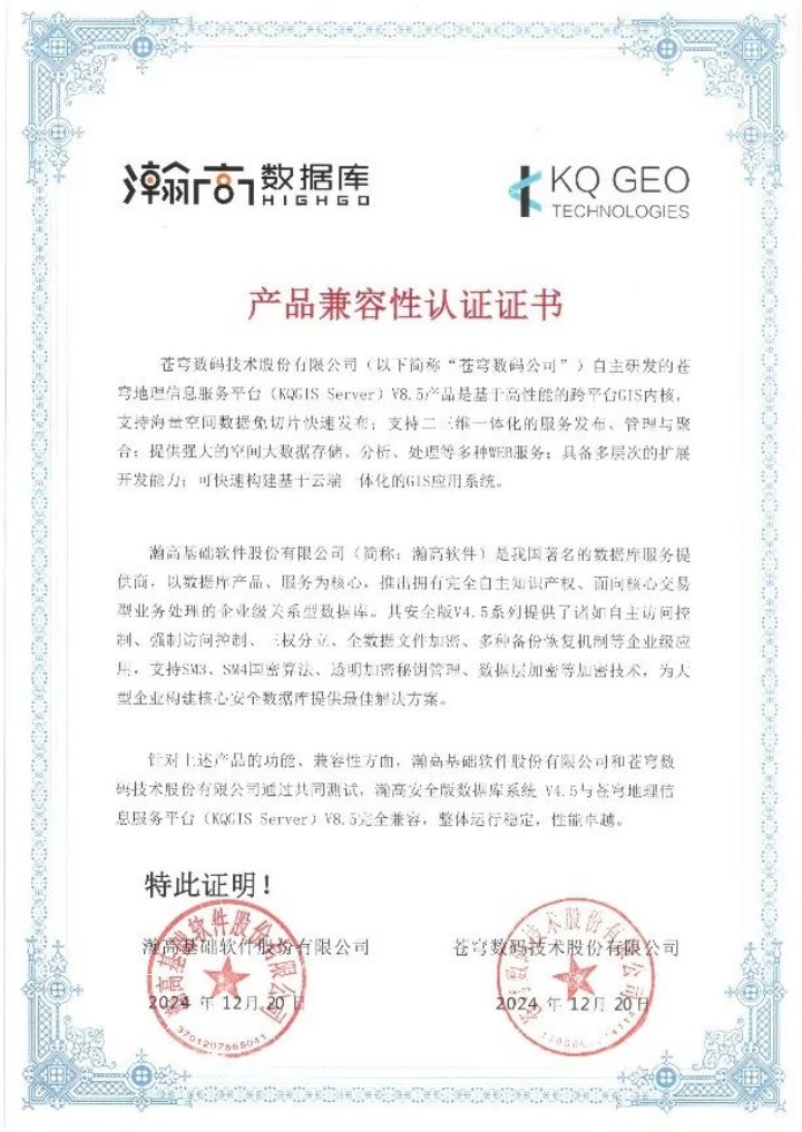 蒼穹數(shù)碼與瀚高數(shù)據(jù)庫(kù)完成產(chǎn)品兼容性互認(rèn)證