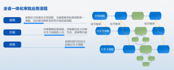針對市縣組卷審查效率低下、省級層面又難以實施全面監(jiān)管等突出問題,江蘇省用途管制一體化審批系統(tǒng)采用新一代工作流框架,引入業(yè)務流程分級授權技術,實現省、市、縣多級業(yè)務一體化線上辦理、聯(lián)動審批與信息回流,顯著提升全省用地項目審批的規(guī)范性與時效性。在業(yè)務規(guī)范方面兼顧全省統(tǒng)籌與地方特色,支持省級層面定義從市縣級勘測定界、組卷、初審、到省級審查的標準化主線流程,各設區(qū)市協(xié)辦處室可根據本地實際情況個性化定制分支子流程節(jié)點與表單,保障全省一體化標準下,地方特色業(yè)務辦理需求也能得到充分支持;在辦件效率方面強化省廳監(jiān)管,支持對各環(huán)節(jié)辦理時限提醒與限制,以全流程線上辦理落實省廳全程跟蹤監(jiān)控。