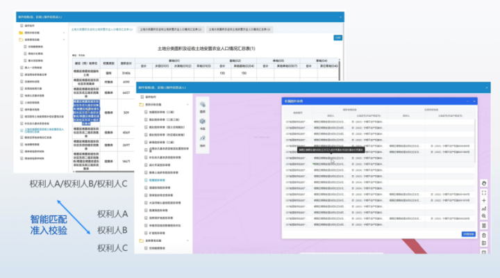 同時提供準入一體化核驗功能進一步減少補正、退件問題,通過構建準入審查分析規(guī)則,強化對報件數據格式規(guī)范、部用途管制監(jiān)管規(guī)范、省廳業(yè)務準入規(guī)范、空間準入規(guī)范四個層面的一體化核驗,保障所有業(yè)務要素、技術指標嚴格契合部、省兩級審批標準,有力確保部用途管制監(jiān)管通過率達到100%。為提升準入核驗的精準度與智能化水平,引入DeepSeek大模型,借助其強大的知識圖譜構建與語義理解分析能力,實現用地審批中被征(用)地單位權屬名稱與不動產權利人名稱的智能比對核驗,規(guī)避因命名邏輯不一致而導致的準入判斷錯誤問題。