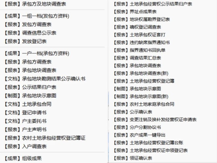 軟件可以按照國家、省市級數(shù)據(jù)標(biāo)準(zhǔn)要求,導(dǎo)出承包方調(diào)查表、發(fā)包方調(diào)查表、公示結(jié)果歸戶表、土地承包經(jīng)營權(quán)證套打、調(diào)查信息公示表、土地承包合同、農(nóng)村土地承包經(jīng)營權(quán)證登記簿、承包地塊調(diào)查表等國標(biāo)報(bào)表。