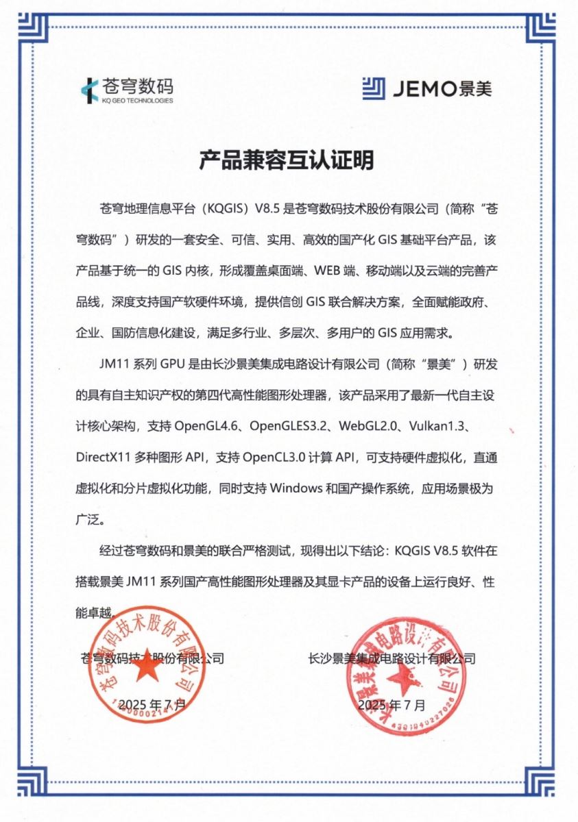 蒼穹數(shù)碼和景嘉微的合作一以貫之,早在2019年,雙方就共同完成了KQGIS和JM7200的適配,是當時業(yè)內(nèi)首次實現(xiàn)國產(chǎn)GIS軟件和國產(chǎn)顯卡相互支持的創(chuàng)舉。2023年,雙方再接再厲,完成了KQGIS和JM920的適配,不僅進一步提升了國產(chǎn)GIS在國產(chǎn)硬件設備上的性能,還為GIS的國產(chǎn)化替代提供更優(yōu)的解決方案。本次蒼穹數(shù)碼和景美的合作(景嘉微子公司),更是雙方深度合作的見證。KQGIS和JM11系列芯片的適配認證,全面覆蓋產(chǎn)品功能完整性、性能穩(wěn)定性以及安全性等關鍵維度,以嚴謹細致的態(tài)度,對雙方產(chǎn)品進行了一場全方位的“嚴格檢驗”。