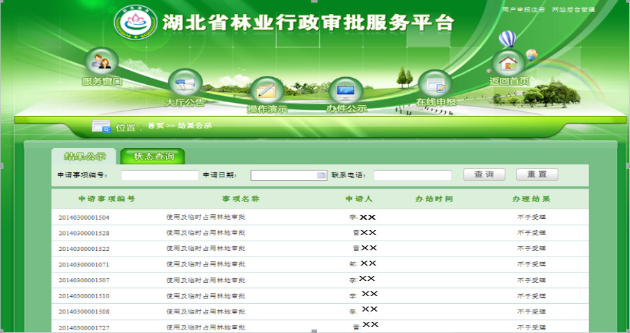 林業(yè)行政審批系統(tǒng)在“3+1+1+1”的信息化建設(shè)框架下(3網(wǎng):局域網(wǎng)、政務(wù)網(wǎng)、外網(wǎng);1庫(kù):行政審批數(shù)據(jù)庫(kù);1個(gè)體系:行政審批數(shù)據(jù)庫(kù)共享交換服務(wù)體系;1個(gè)平臺(tái):林業(yè)信息化服務(wù)架構(gòu)平臺(tái)),實(shí)現(xiàn)了行政審批工作的高度信息化和集成化,通過互聯(lián)網(wǎng)為企業(yè)用戶和林農(nóng)提供一站式服務(wù)。圍繞23類行政審批事項(xiàng),并從行政處罰類、行政征收類、行政強(qiáng)制類、行政獎(jiǎng)勵(lì)類、行政確認(rèn)類、行政監(jiān)督類、行政服務(wù)類、行政備案類、專項(xiàng)資金分配類、其他行政權(quán)力類中選擇7項(xiàng)具有代表性的行政服務(wù)事項(xiàng)作為主要建設(shè)內(nèi)容,基于林業(yè)專網(wǎng),實(shí)現(xiàn)省市縣三級(jí)行政審批辦事流程的信息化、網(wǎng)絡(luò)化、規(guī)范化。
