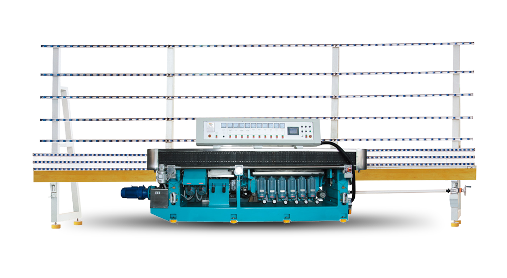 該機(jī)主要用于玻璃底邊及前大倒角磨邊及拋光,該機(jī)采用PLC控制,其中前面六個(gè)馬達(dá)角度在0°~45°間任意可調(diào),并在觸摸顯示屏上顯示角度及倒角寬度,自動(dòng)磨削時(shí)可較準(zhǔn)確的調(diào)整和設(shè)置前倒角的各項(xiàng)參數(shù)。