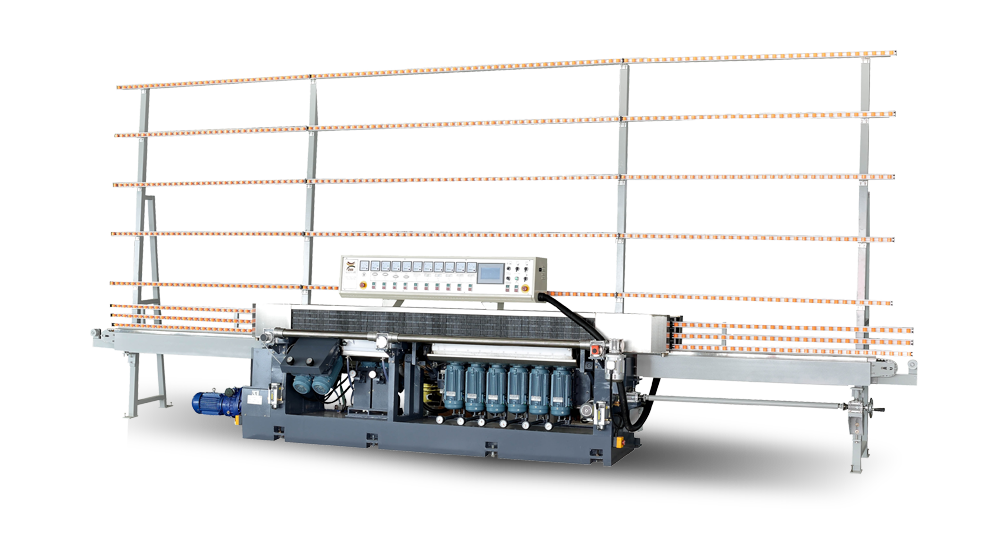 該機采用PLC控制,磨頭電機采用ABB電機,主要用于玻璃底邊及前大倒角磨邊及拋光,其中前面五個馬達角度在0°~45°間任意可調(diào),并在觸摸顯示屏上顯示角度及倒角寬度,自動磨削時可較準確的調(diào)整和設置前倒角的各項參數(shù)。